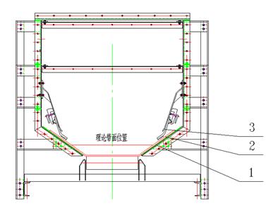 圖一中3處為內(nèi)側(cè)密封防塵裙板,該裙板采用橡膠硫化聚氨酯制作成型,以足夠彈性和韌性貼緊皮帶內(nèi)側(cè),以達(dá)到face-face密封效果。橡膠具有足夠彈性,能夠保證裙板和皮帶之間形成面接觸,而聚氨酯具有足夠的耐磨性和自潤(rùn)滑性,保證裙板較長(zhǎng)的使用壽命。采用上述密封結(jié)構(gòu),徹底杜絕粉塵從導(dǎo)料槽兩側(cè)逸出的問(wèn)題。3處裙邊夾持器所在位置為耐磨鋼板,能夠有效防止物料飛濺。此種“內(nèi)外夾擊”的結(jié)構(gòu)形式,能夠有效防止皮帶跑偏和振動(dòng),較少皮帶機(jī)維護(hù)時(shí)間,保證皮帶機(jī)正常出力。