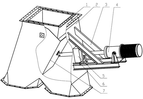 1- 進(jìn)料口 2- 三通 3-電動(dòng)支座 4-電動(dòng)推桿 5-密封組件 6- 限位裝置 7- 調(diào)向筒